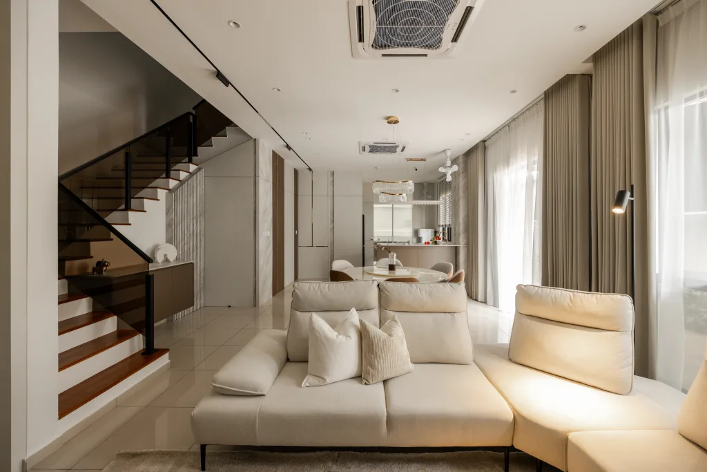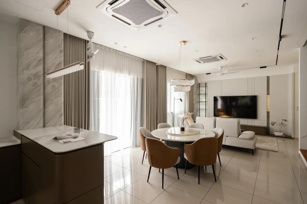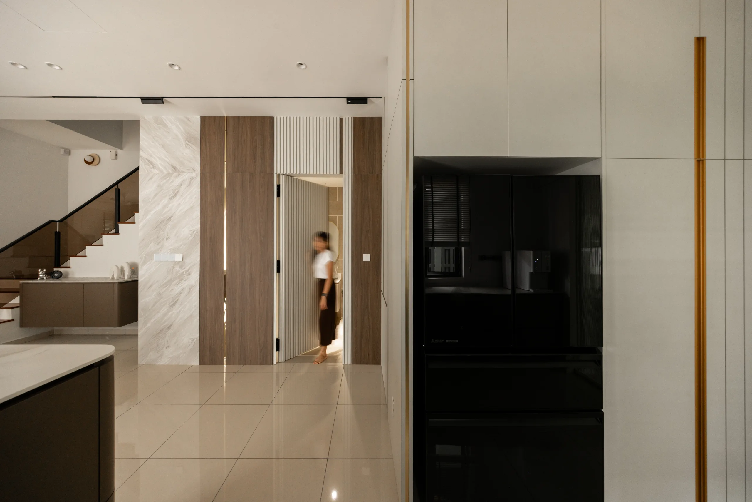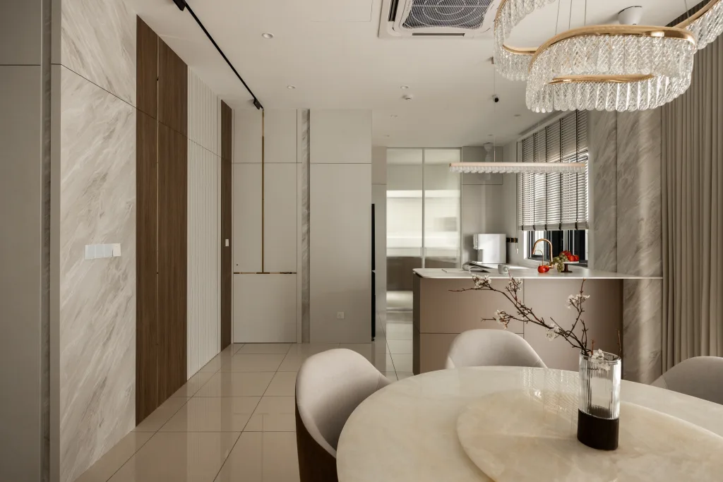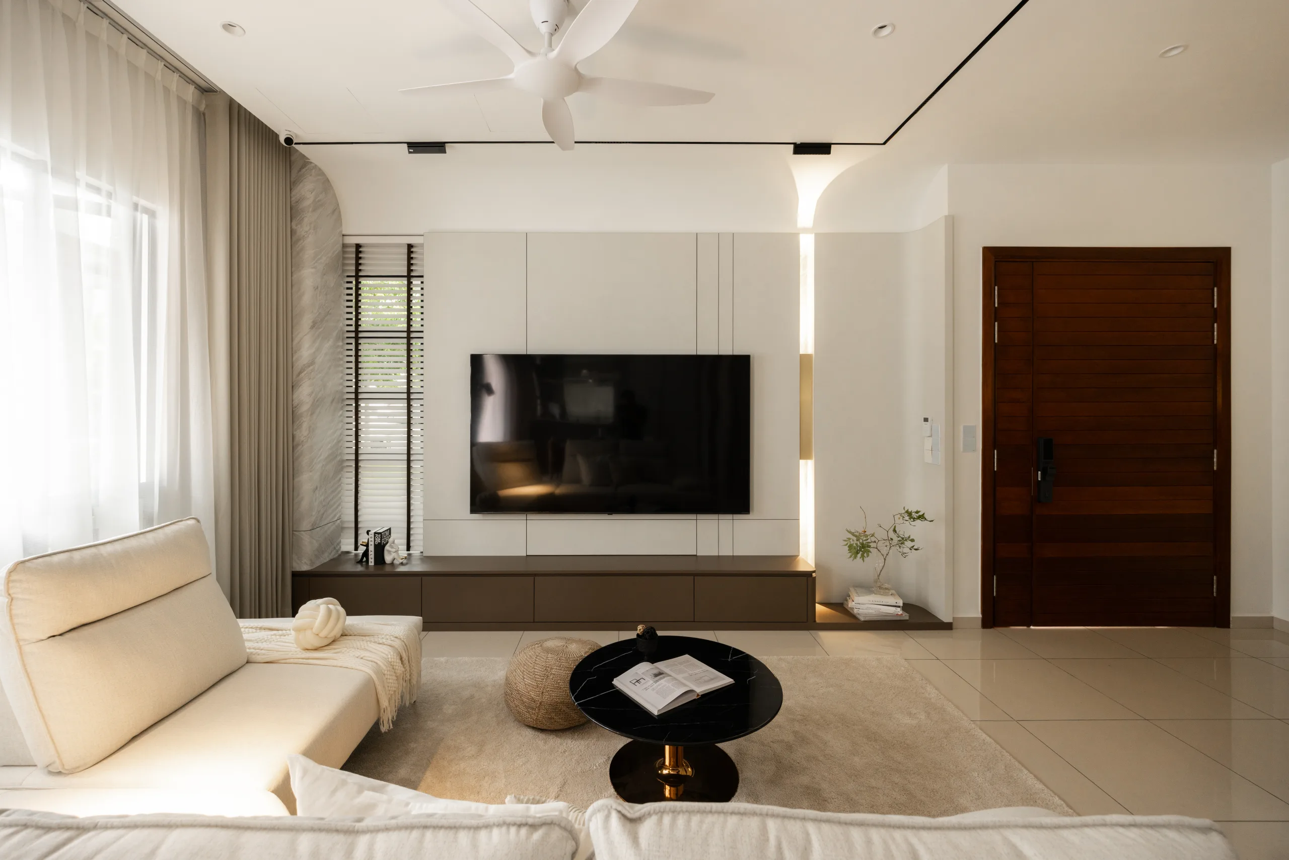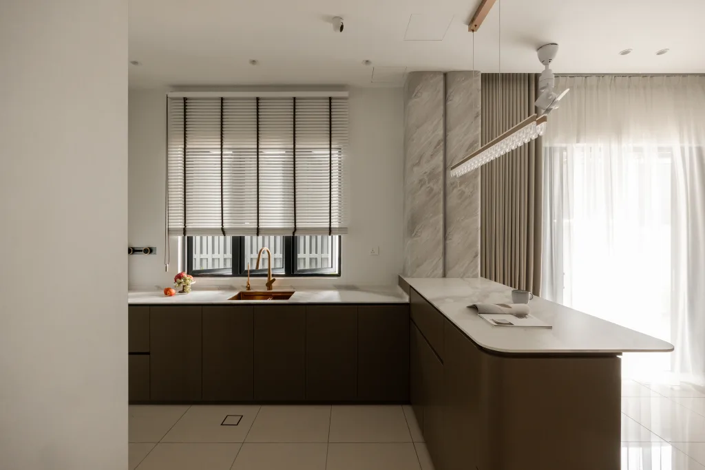 Quiete Layers – A warm minimalist home defined by marble, soft beige tones, and walnut wood. Gentle curves are subtly integrated to soften clean lines and create a natural flow throughout the space. Through thoughtful layering of materials, light, and form, the home feels calm, grounded, and timeless