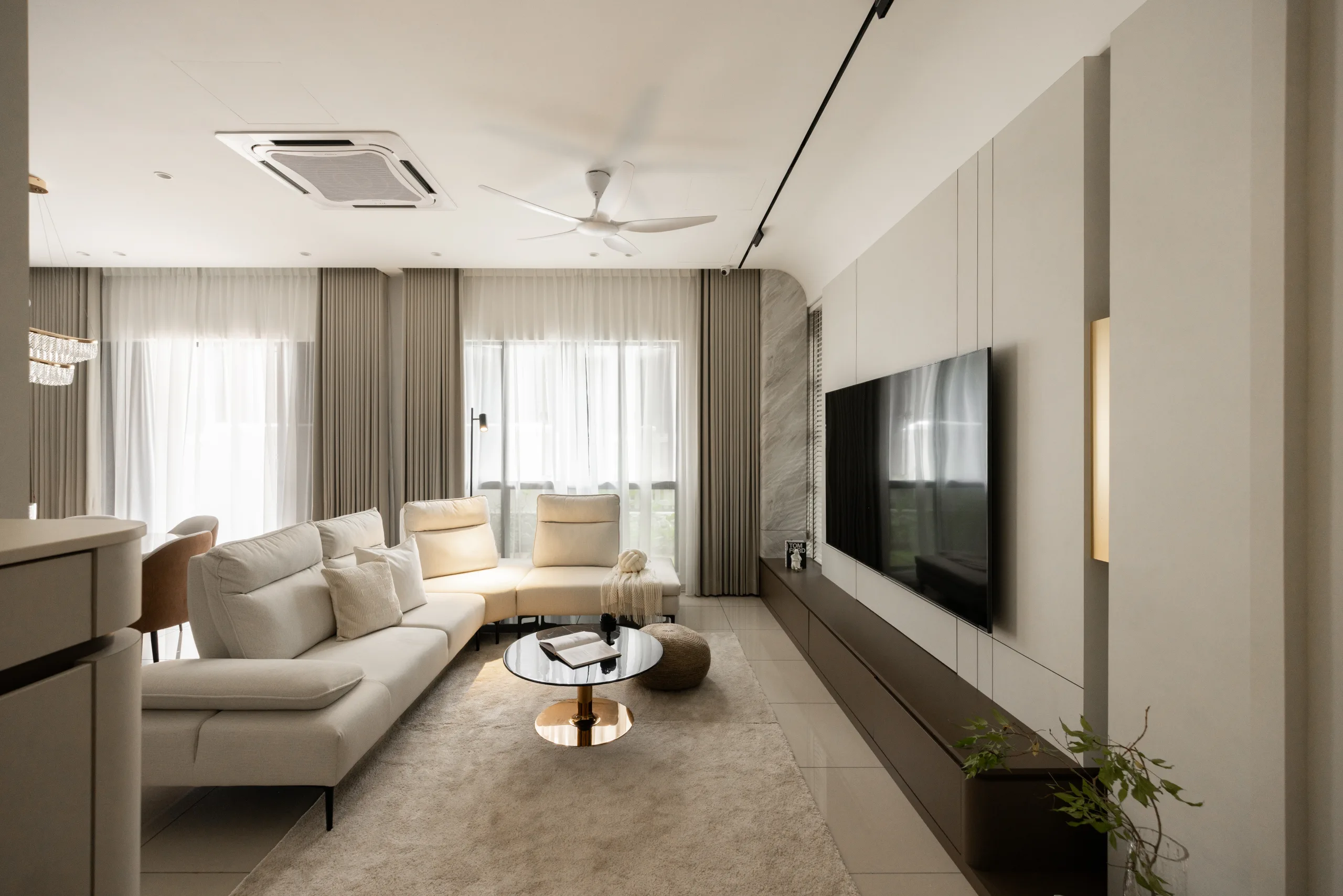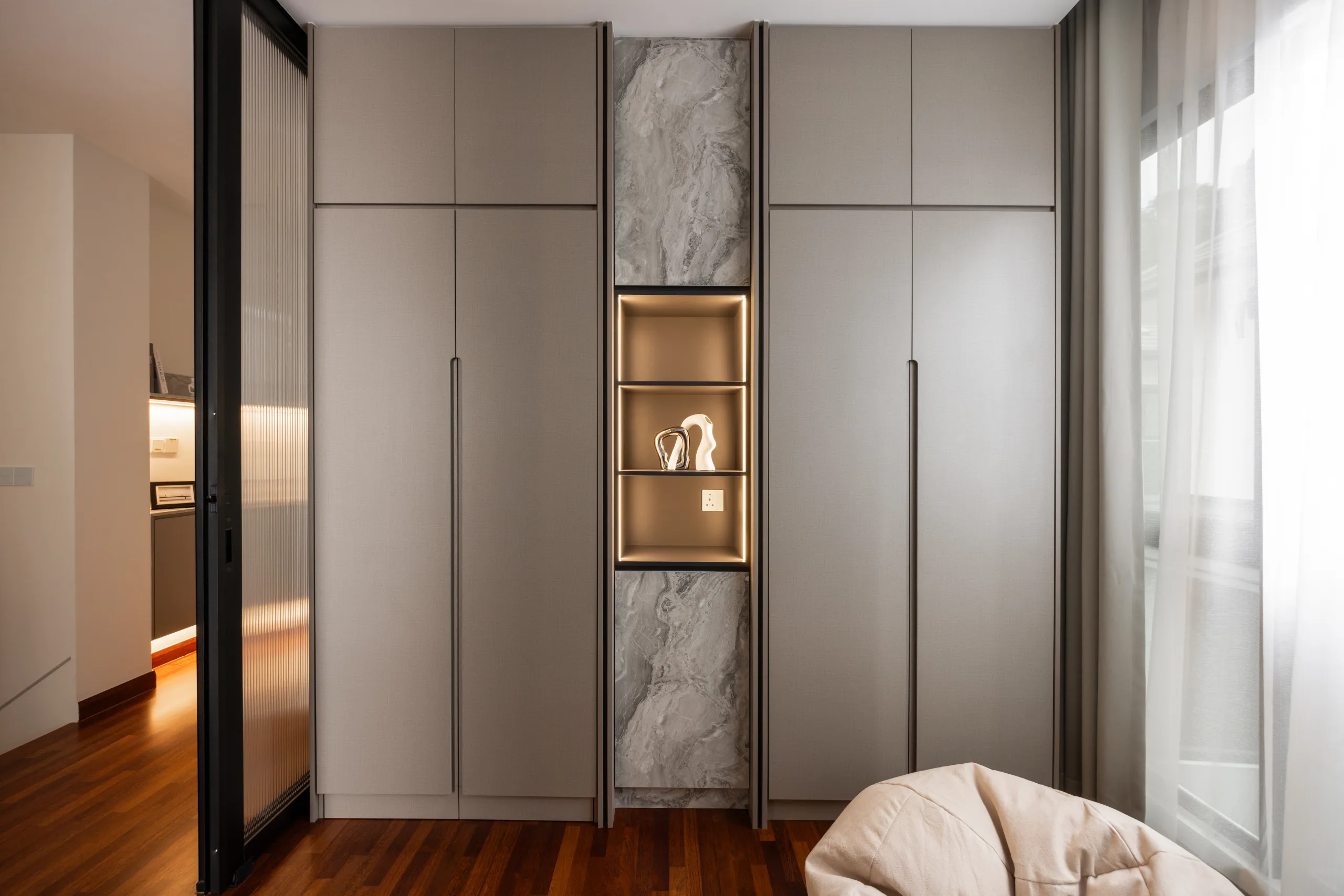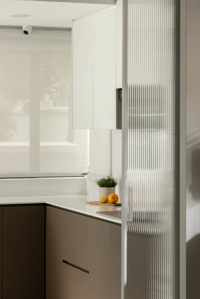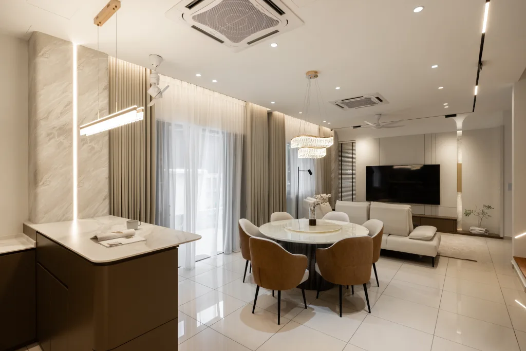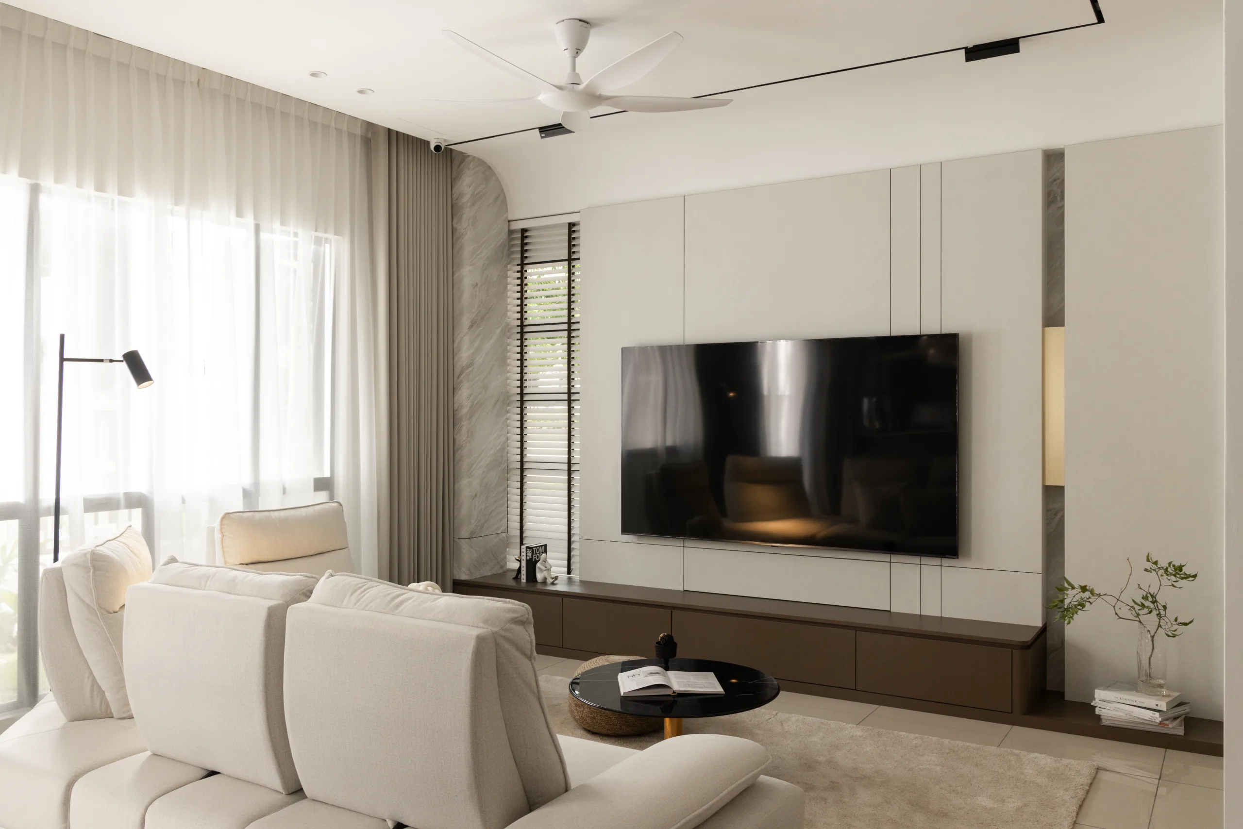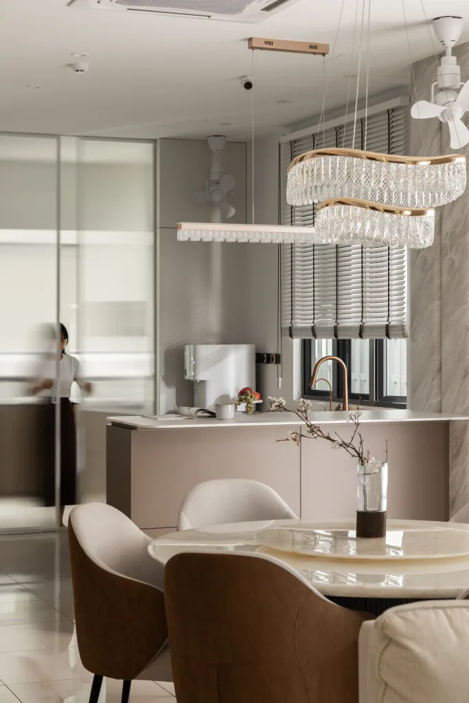 Quiete Layers – A warm minimalist home defined by marble, soft beige tones, and walnut wood. Gentle curves are subtly integrated to soften clean lines and create a natural flow throughout the space. Through thoughtful layering of materials, light, and form, the home feels calm, grounded, and timeless