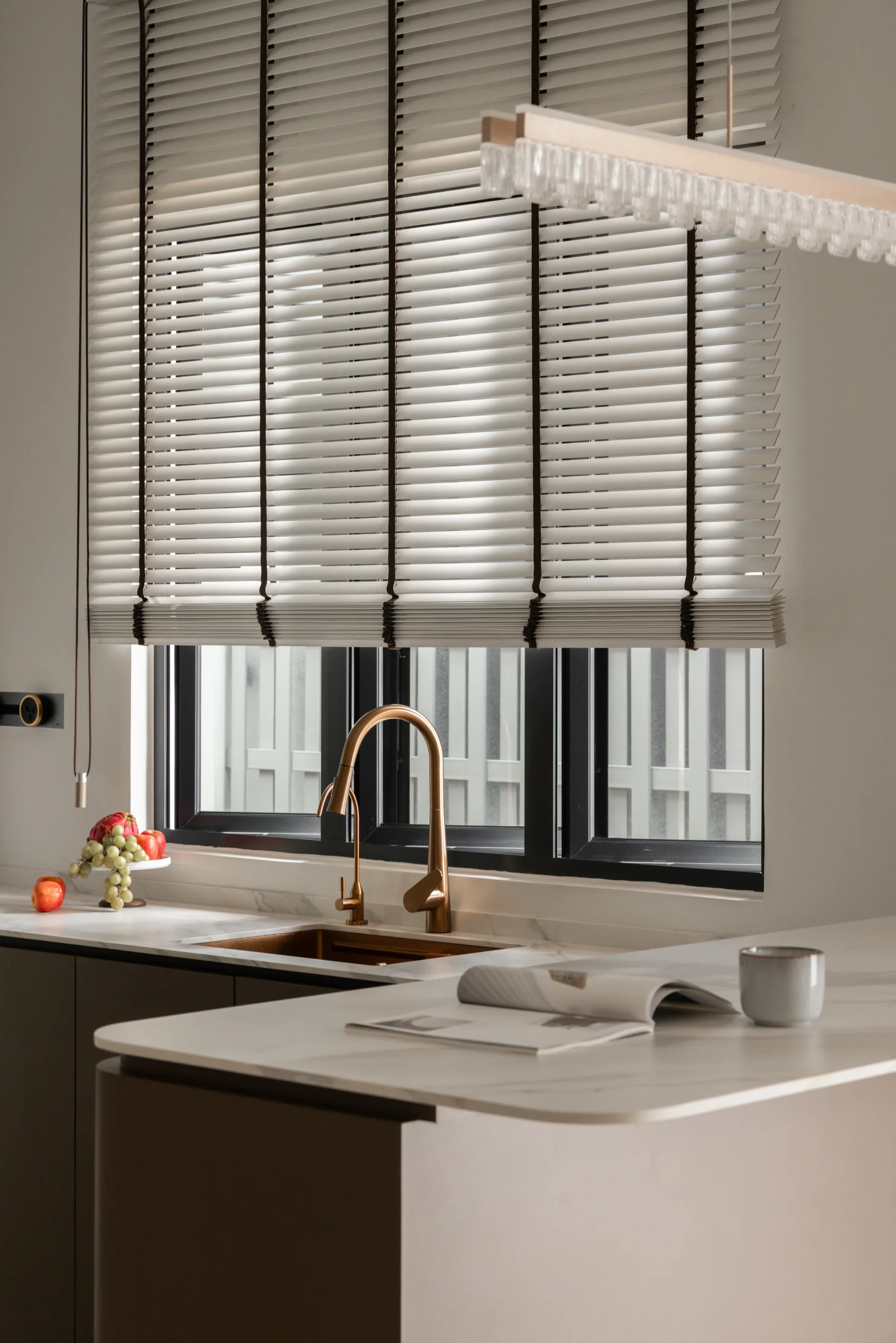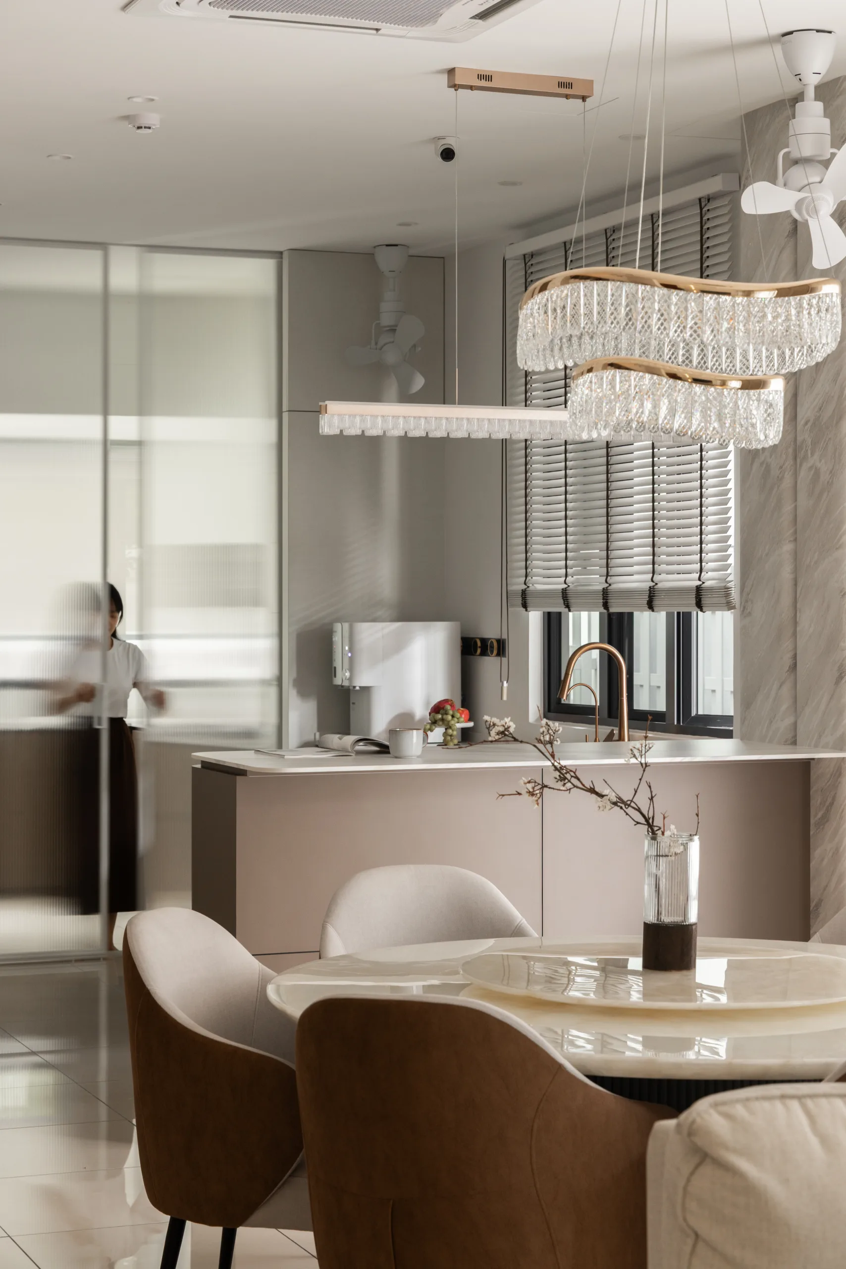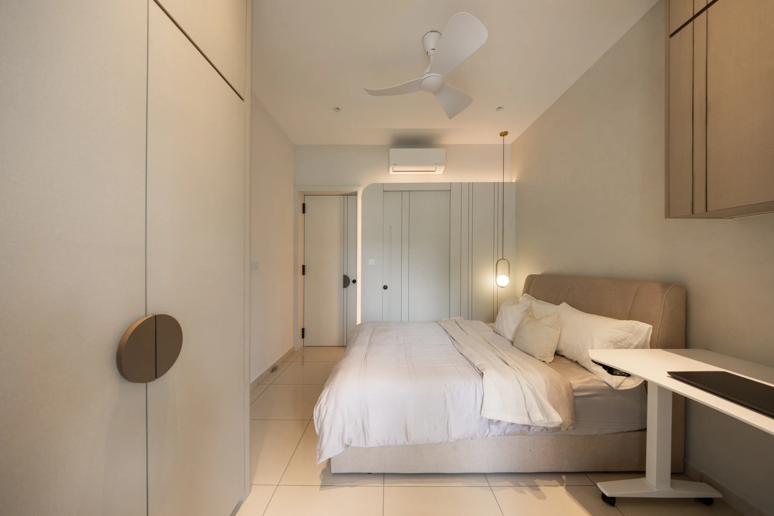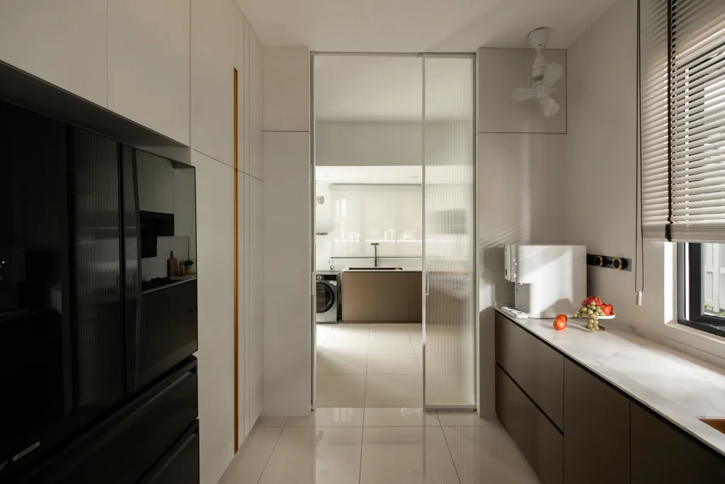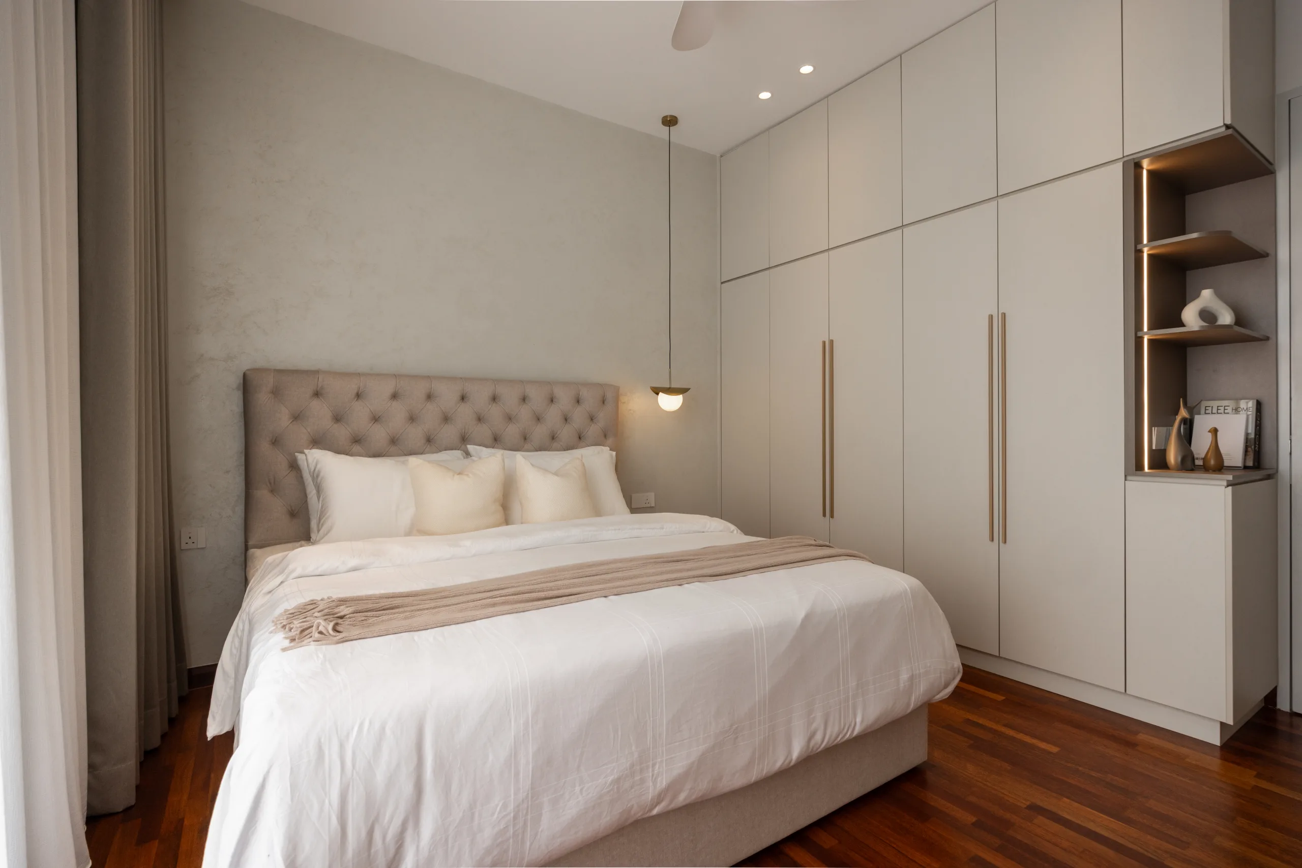 Quiete Layers – A warm minimalist home defined by marble, soft beige tones, and walnut wood. Gentle curves are subtly integrated to soften clean lines and create a natural flow throughout the space. Through thoughtful layering of materials, light, and form, the home feels calm, grounded, and timeless