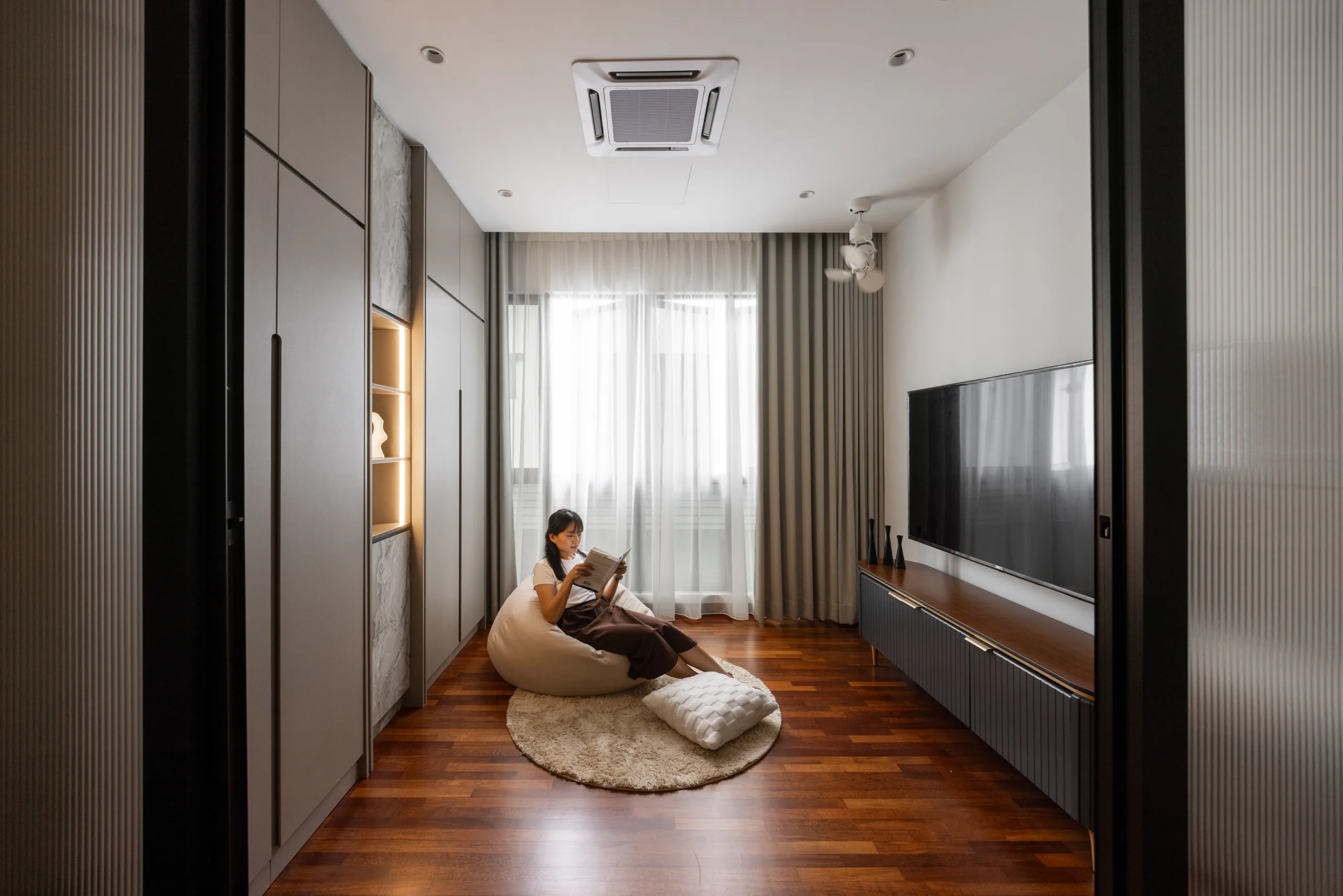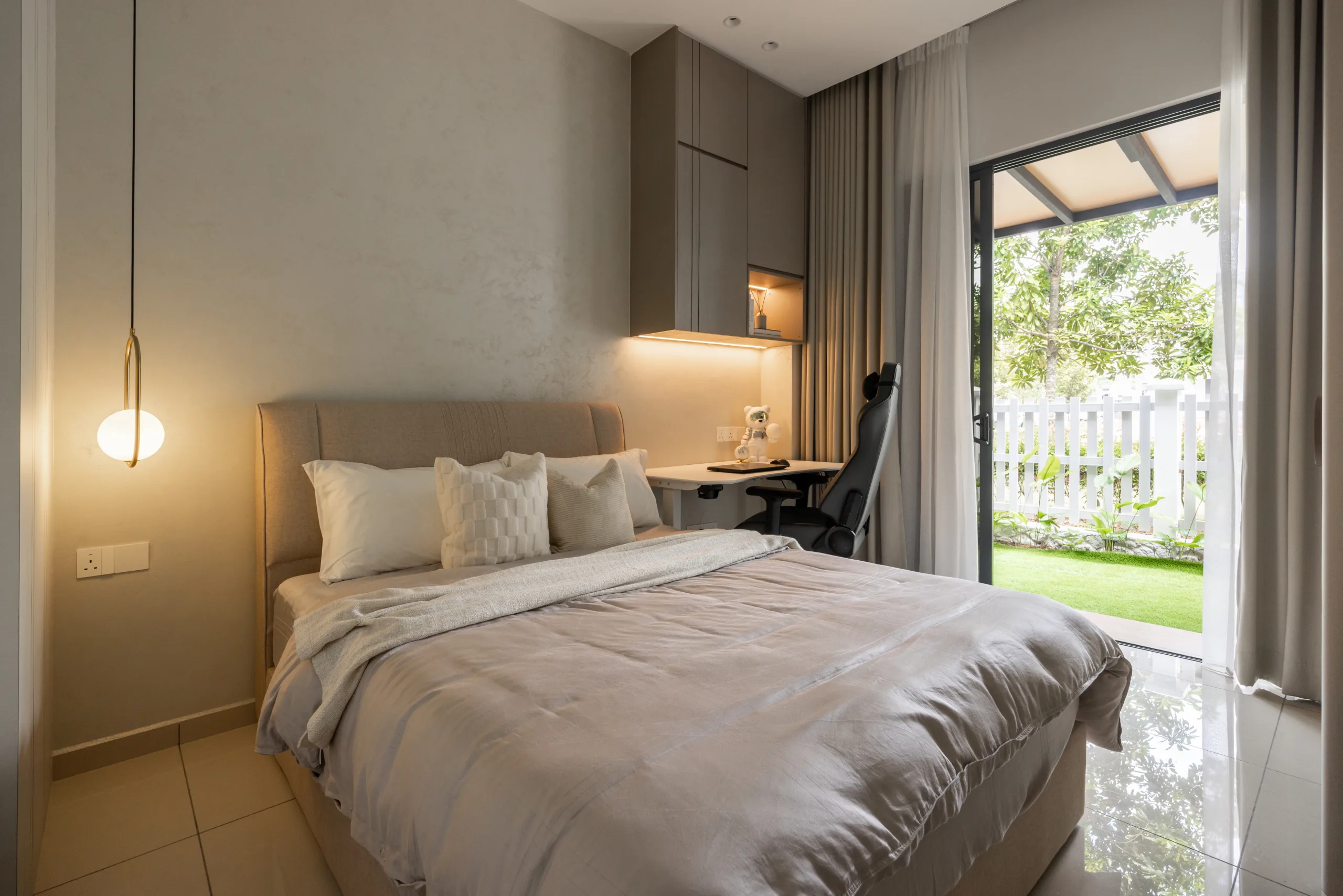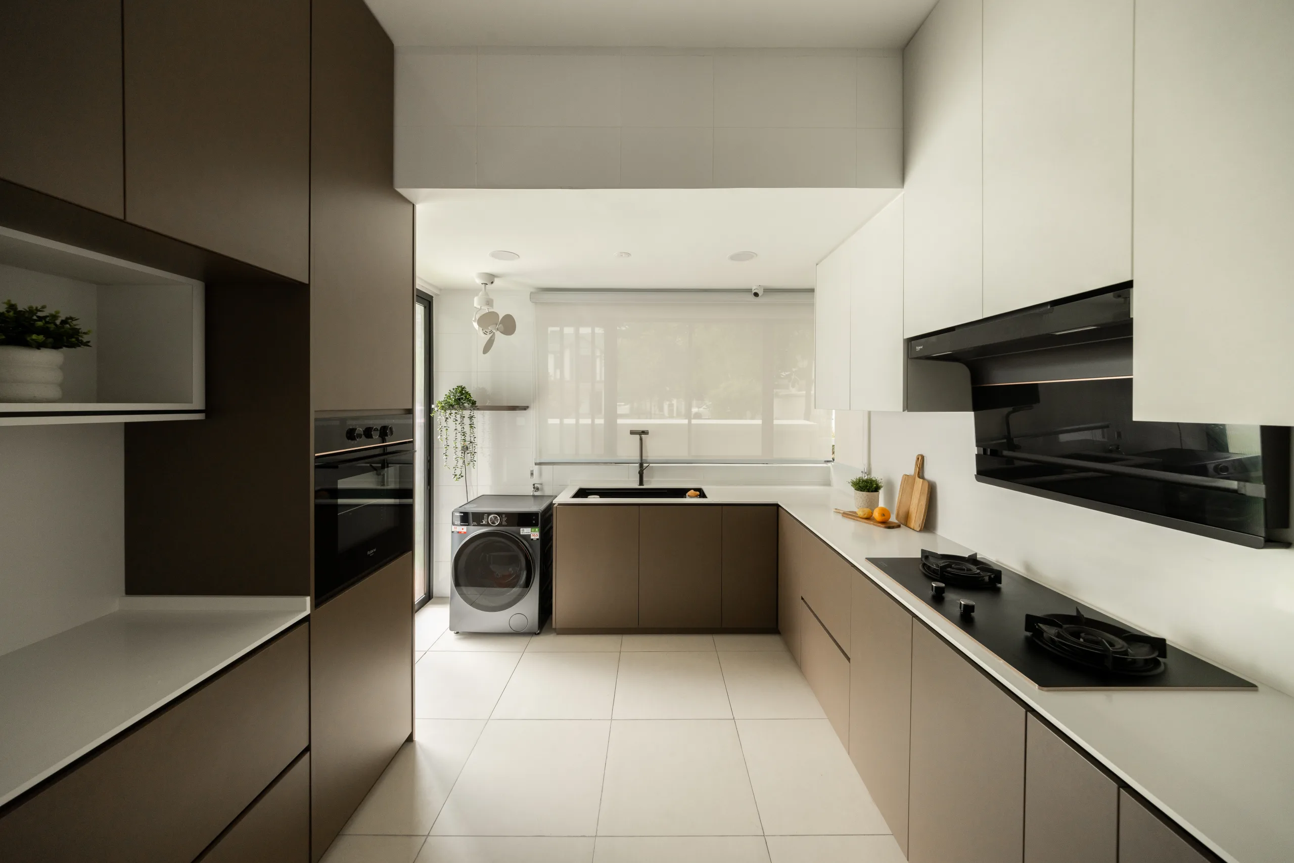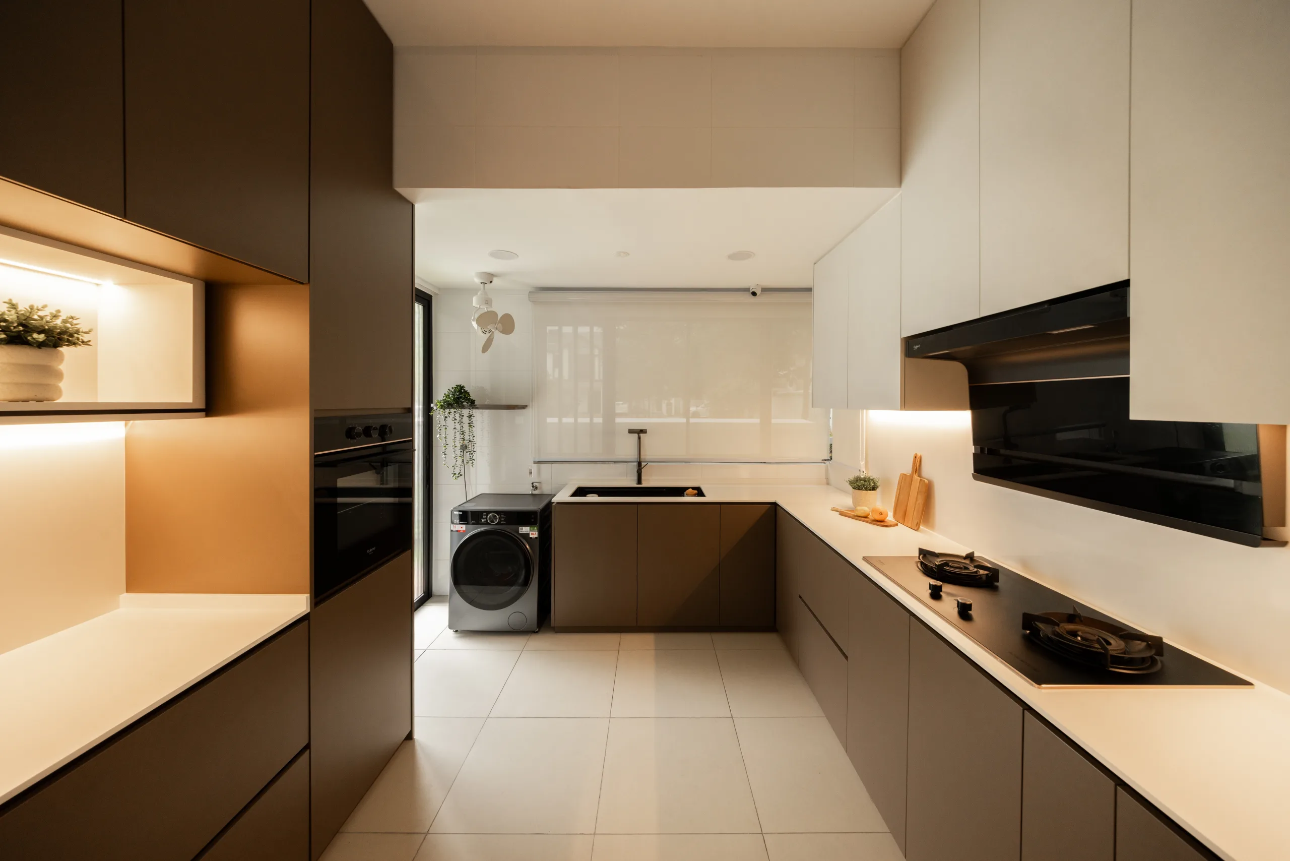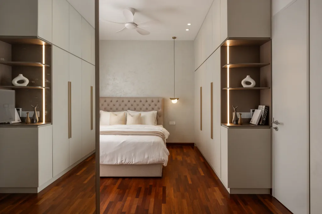 Quiete Layers – A warm minimalist home defined by marble, soft beige tones, and walnut wood. Gentle curves are subtly integrated to soften clean lines and create a natural flow throughout the space. Through thoughtful layering of materials, light, and form, the home feels calm, grounded, and timeless